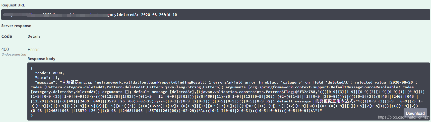 我们还需用到@Validated注解,该注解使用在controller层的方法参数中,只有使用该注解,@pattern中的时间格式校验才起作用,这一点尤其重要。