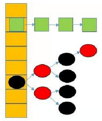 首先有一个每个元素都是链表(可能表述不准确)的数组,当添加一个元素(key-value)时,就首先计算元素key的hash值,以此确定插入数组中的位置,但是可能存在同一hash值的元素已经被放在数组同一位置了,这时就添加到同一hash值的元素的后面,他们在数组的同一位置,但是形成了链表,同一各链表上的Hash值是相同的,所以说数组存放的是链表。而当链表长度太长时,链表就转换为红黑树,这样大大提高了查找的效率。 当链表数组的容量超过初始容量的0.75时,再散列将链表数组扩大2倍,把原链表数组的搬移到新的数组中
