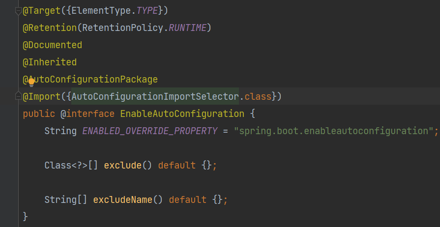 此注解是自动装配的核心注解, @EnableAutoConfiguration的内部如图,其中有注解@AutoConfigurationPackage和@Import两个注解。