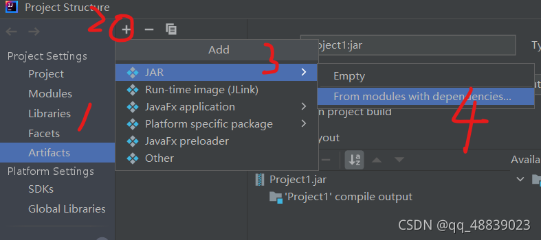 2. Artifacts—>加号—>JAR—>From modules with dependencies