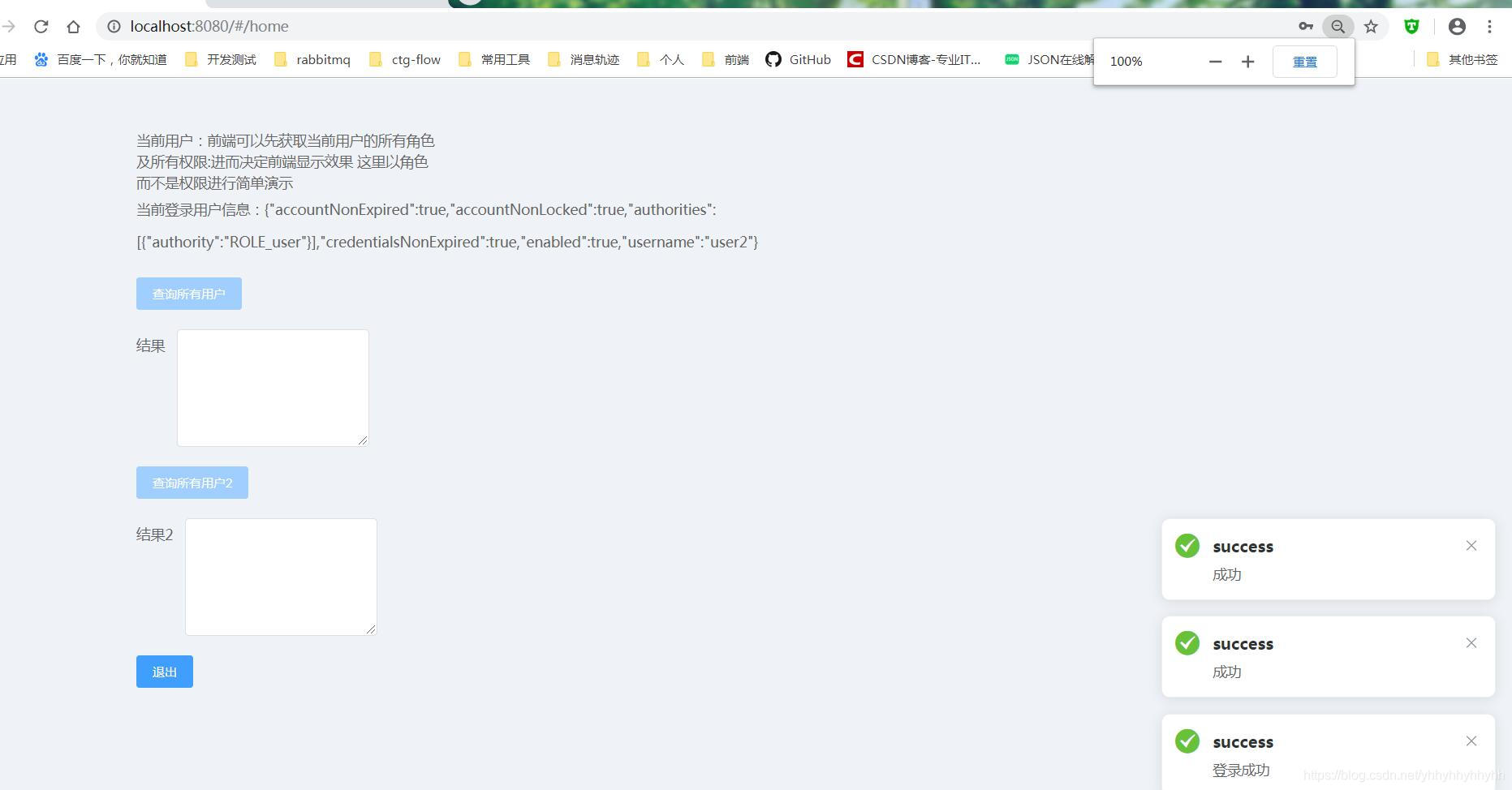 2)输入admin manager user2 的正确用户名和密码后,登录成功返回的页面显示不同效果;三个用户登录成功后,直接访问url,会根据用户的角色不同进行拦截,点击退出后,重新回到http://localhost:8080/#/login
