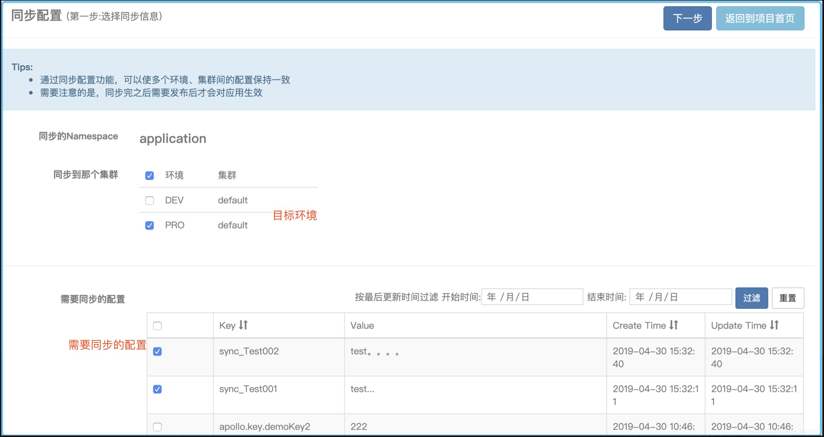 选择需要同步的配置,以及目标环境