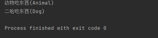 修改后的部分代码如上,此时,我们之前的 animal2 直接调用 eat,就可以得到下面的结果