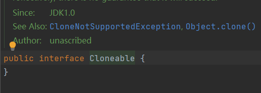 但是我们发现就算继承之后,我们也不能通过创建的引用去找到一个克隆的方法。此时我们可以点到 Cloneable的定义看看