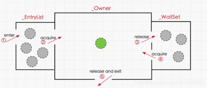 ObjectMonitor的加锁解锁过程如下图所示,ObjectMonitor中有两个队列,_WaitSet 和 _EntryList,用来保存ObjectWaiter对象列表(每个等待锁的线程都会被封装成ObjectWaiter对象);整个monitor运行的机制过程如下: