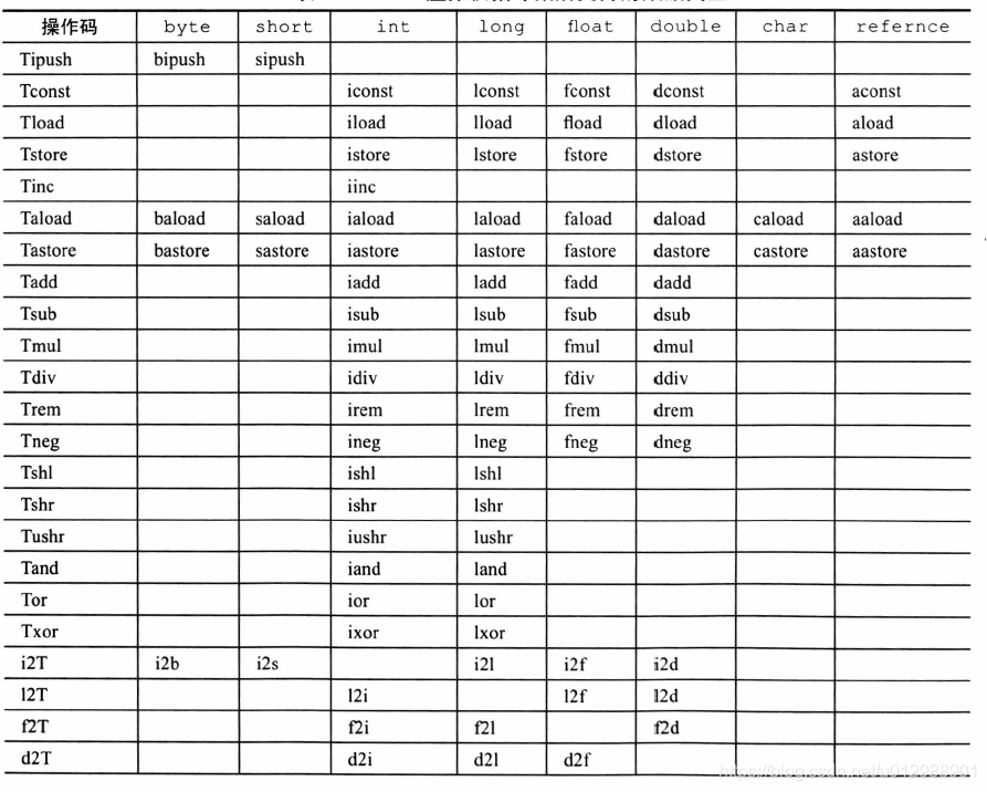 下面列出了Java虚拟机支持的字节码指令集。用数据类型列所代表的特殊字符替换opcode列的指令模板中的T,就可以得到一个具体的字节码指令(比如byte类型的b替换Tipush中的T后得到bipush)。如果在表中指令模板与数据类型两列共同确定的单元格为空,则说明虚拟机不支持对这种数据类型执行这项操作。