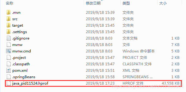 然后启动springboot应用,启动端口为9999,访问 http://localhost:9999/heap 后触发堆内存溢出,可以看到控制台输出已经生成了dump文件java_pid16500.hprof