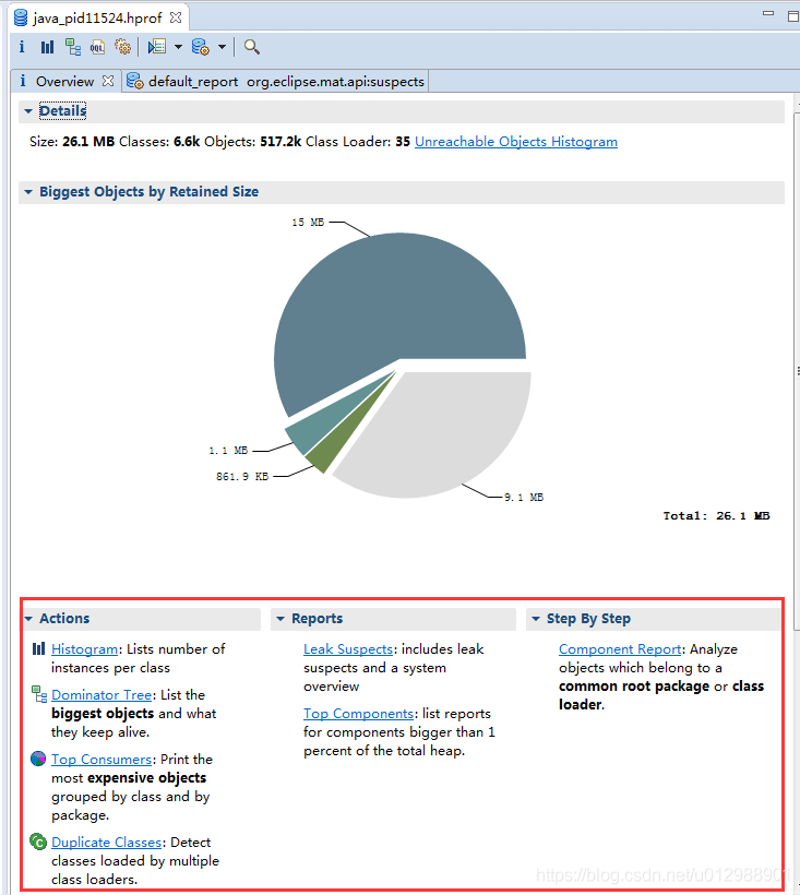 - 4.Leak Suspects通过MA自动分析,会出具内存泄漏可能产生的原因的报告。
