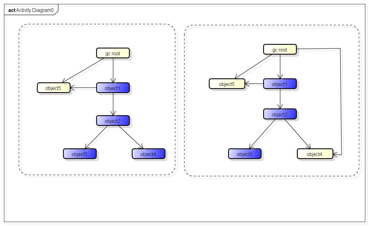 对于上图左边的object1,object1大小就是shallow size,object1及所有蓝色对象就是该对象直接或是间接引用的就是retained size。右图中object4还被gc roots引用到,那么retained size就不包含这个。