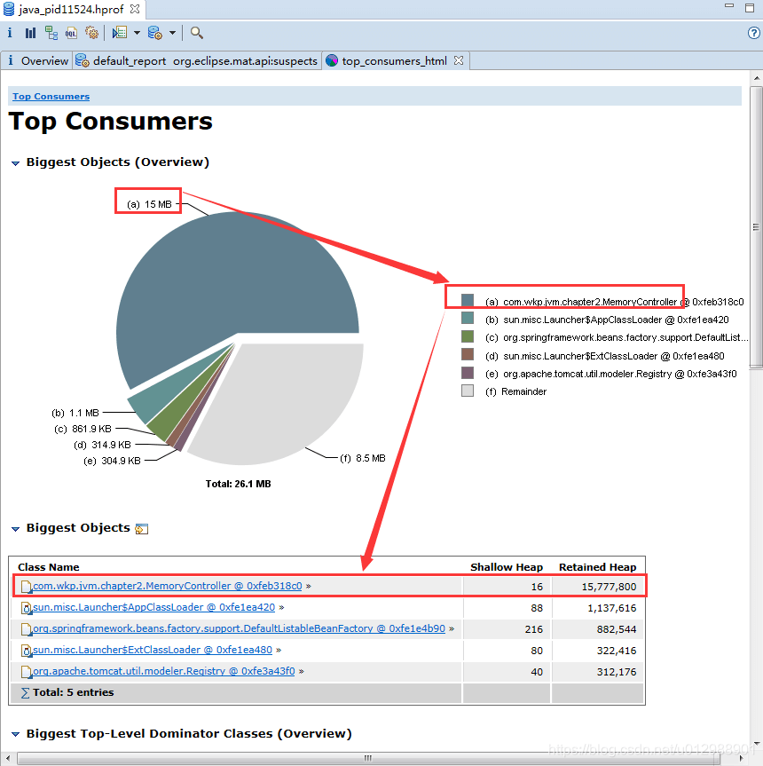 Top consumers如下图:这里显示了内存中最大的对象有哪些,他们对应的类是哪些,类加载器classloader是哪些。可以看到MemoryController类的对象占用了15MB的堆内存,占比达50%多,这是很不正常的。我这里只截图了关于对象相关的,后面还会有类,类加载器,包相关的信息,就不一一截图了,大家可以自己看一下。
