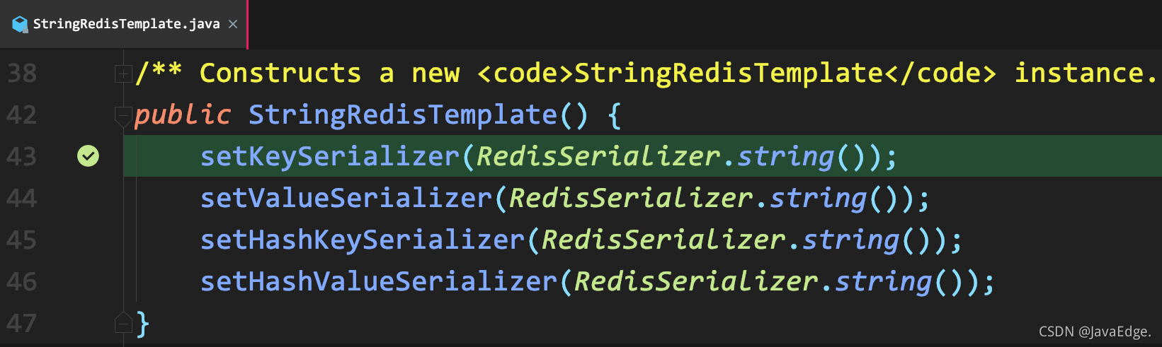 以 StringRedisSerializer 为例。StringRedisTemplate构造器直接指定了KeySerializer为 RedisSerializer.string():