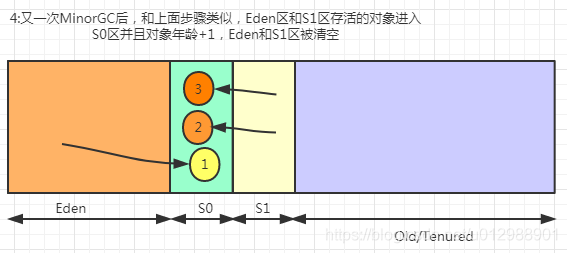 4:又一次MinorGC后,和上面步骤类似,Eden区和S1区存活的对象进入S0区并且对象年龄+1,Eden和S1区被清空