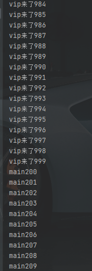 在主线程中的i=100的时候,vip线程进来插队,直到vip执行完,主线程才继续
