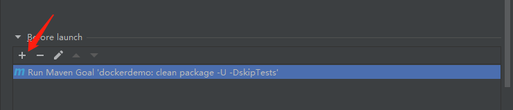上图中最下面的那个"Run Maven Goal"点击后,会弹出一个小窗口 ,用来输入要执行的maven命令,这里输入clean package -U -DskipTests,表示每次在构建镜像之前,都会将当前工程清理掉并且重新编译构建: