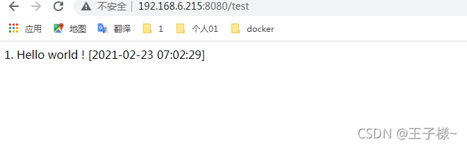 在浏览器上访问地址:http://192.168.6.215:8080/test,得到响应如下图所示,可见应用在容器中正常运行: