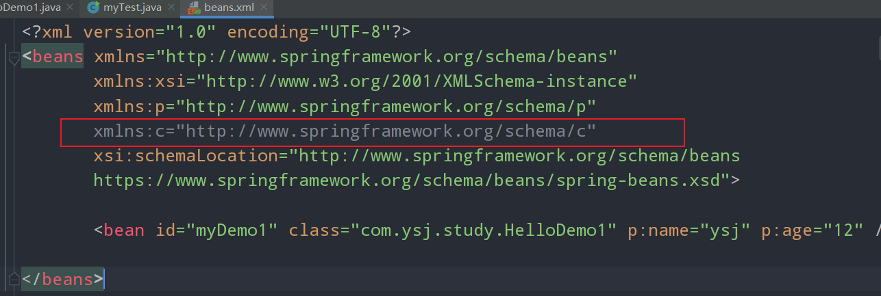 首先在使用c命名空间之前你需要在相应的xml文件内写入一些支持配置信息