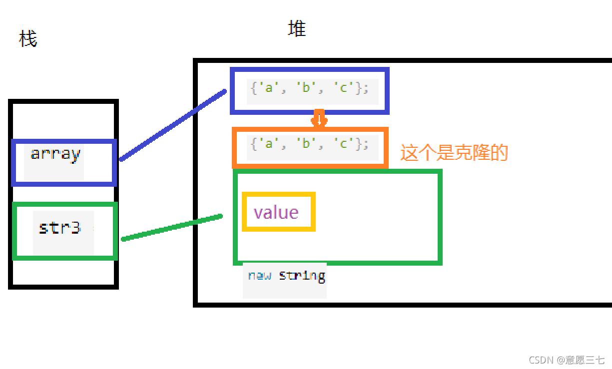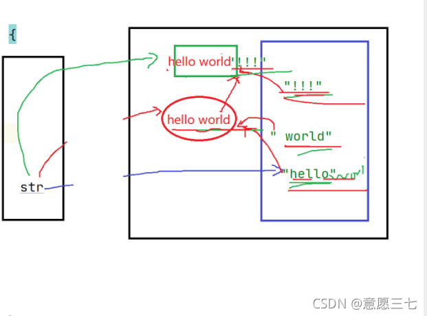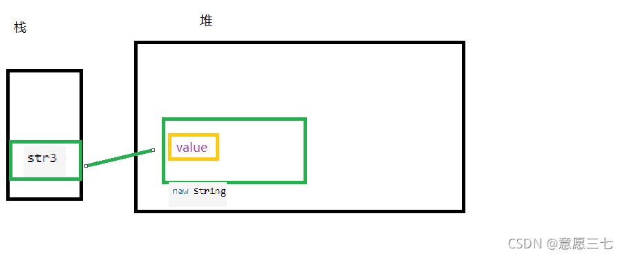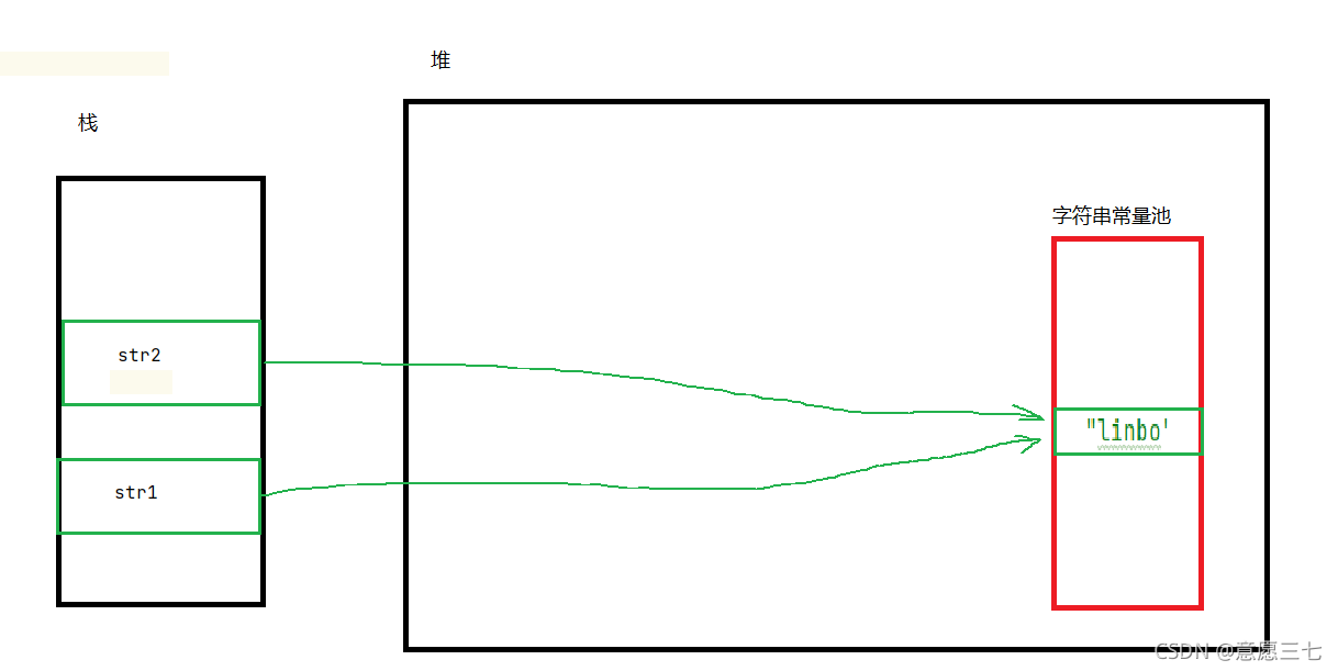 -我们都知道字符串存放在常量池里面,但是现在str也是hello,那么new string会先去常量池里面找有没有一样的,有一样的就引用常量池里面的,就不需要在放进去新建一个:
