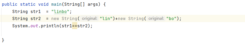 最终str1是指向常量池里面的,str2是指向堆里面的,所以是false。