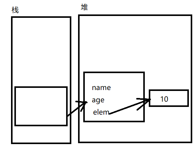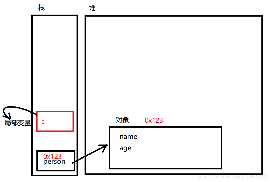- 第 11 行实例化时person 是一个引用变量,此时会在计算机的栈空间里面开辟一块空间用于存放 person,在堆上开辟一块空间用于存放对象,person 引用的就是 栈空间上面的对象。