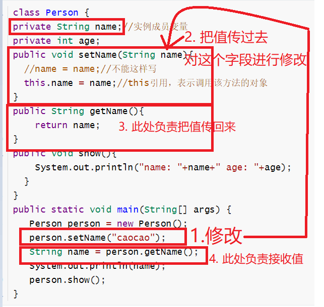 但是要注意的是,此处的代码最上面 那个Person 类在示例化的时候就已经给成员变量赋初值了,这其实是不对的,因为上面已经说过了,类其实是一切对象的总和,他是不可以这样被具体化的(简单来讲其实就是不可能所有人都叫张三)。