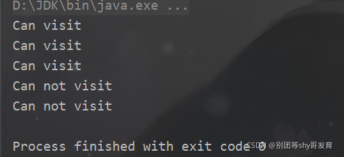 随后使用for循环里通过调用canVisit方法模拟发出5个请求。在调用该方法时,通过传入参数指定限流所用的键为"PayRequest",同时指定了100秒内只能处理3个请求。运行之后控制台的效果如下:
