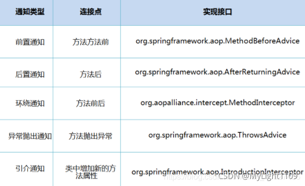 SpringAOP中,通过Advice定义横切逻辑,Spring中支持5种类型的Advice:
