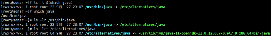 # 查找安装目录 which java 或 ls -l $(which java) # 如果显示的是/usr/bin/java请执行下面命令 ls -lr /usr/bin/java ls -lrt /etc/alternatives/java # 输出:/etc/alternatives/java -> /usr/lib/jvm/java-11-openjdk-11.0.12.0.7-0.el7_9.x86_64/bin/java # 上面的/usr/lib/jvm/java-11-openjdk-11.0.12.0.7-0.el7_9.x86_64就是JAVA的安装路径