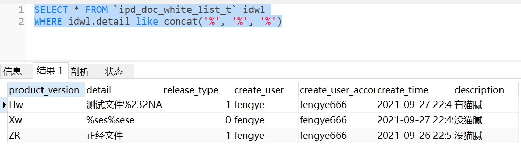 这样使用模糊查询在分页搜索中可以解决90%的匹配搜索功能,但是,还是有10%是阴沟翻船的事情。比如现在我要匹配文件名detail中带有'%'的文件,使用这个语句就会造成搜索失效,直接返回表中的limit所有数据。