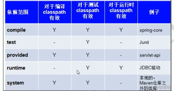 在dependency下添加scope标签,其表示当前依赖在什么时候生效,其常用值如下