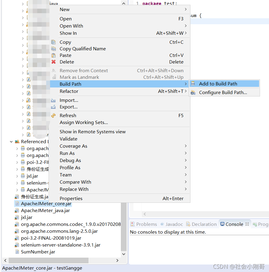 1.首先创建好工程,用到两个Jmeter包-ApacheJMeter_java.jar、ApacheJMeter_core.jar,直接从Jmeter复制项目里,并且右键Buid Path就可以了。