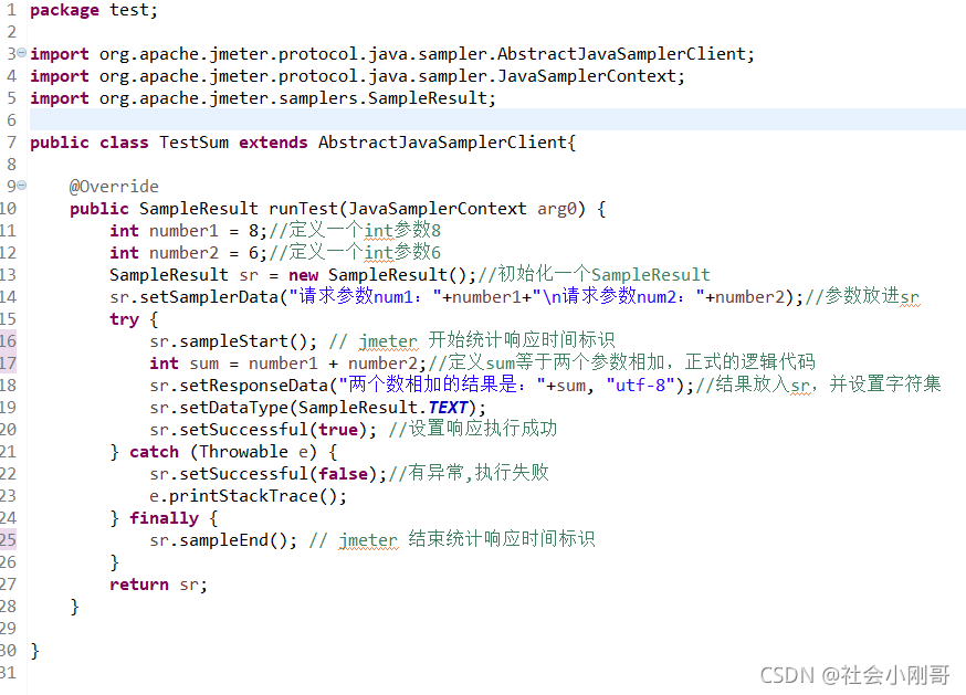 3.写一个简单的demo,两个数相加为sum结果。初始化一个SampleResult,然后sr.sampleStart()作为Jmeter开始统计响应时间标识,相加过程为正式的逻辑代码,把返回结果放入sr并设置字符集,sr.setSuccessful()设置成功与否,最后加上sr.sampleEnd()结束统计响应的标识,返回sr即可。