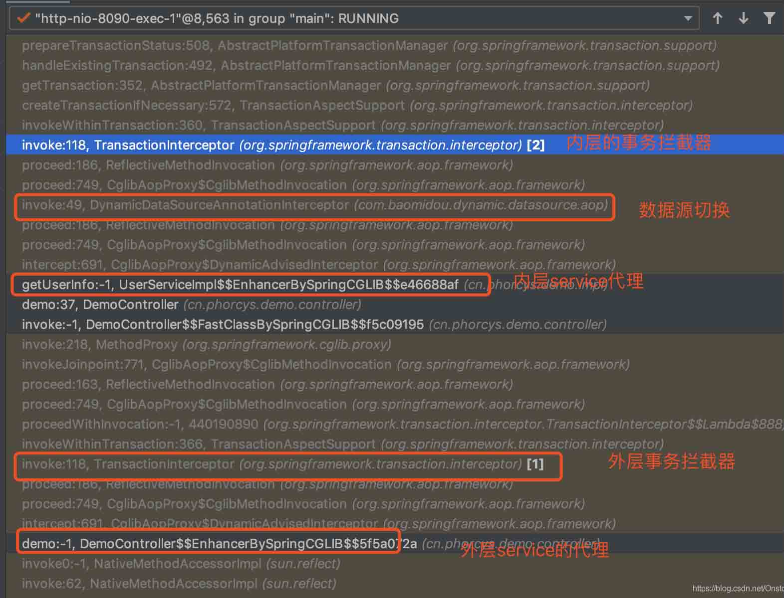 上面就是@DS大概实现,然后我就碰到坑了,外层service加了@Transactional,通过service调用另一个数据源做insert,在切面里看数据源切换了,但是还是显示事务内的数据源还是旧的,代码结构简单罗列下: