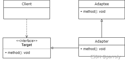 此时将3.5mm耳机比作客户端(客户类),它期望得到音乐信号的目标是3.5mm接口(目标抽象类),type-c接口则是手机提供的音乐信号传输接口(适配者类),与耳机接头不兼容,而转接线(适配器类)可以将type-c接口包装为耳机可以插入的3.5mm接口,能够解决手机与耳机的不兼容问题,实现用耳机接收手机播放的音乐信号。