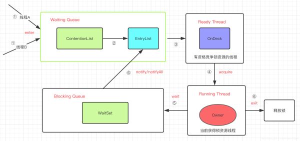 ObjectMonitor中有两个队列,_WaitSet 和 _EntryList,用来保存ObjectWaiter对象列表( 每个等待锁的线程都会被封装成ObjectWaiter对象),_owner指向持有ObjectMonitor对象的线程,当多个线程同时访问一段同步代码时,首先会进入 _EntryList 集合,当线程获取到对象的monitor 后进入 _Owner 区域并把monitor中的owner变量设置为当前线程同时monitor中的计数器count加1,若线程调用 wait() 方法,将释放当前持有的monitor,owner变量恢复为null,count自减1,同时该线程进入 WaitSet集合中等待被唤醒。若当前线程执行完毕也将释放monitor(锁)并复位变量的值,以便其他线程进入获取monitor(锁)。如下图所示