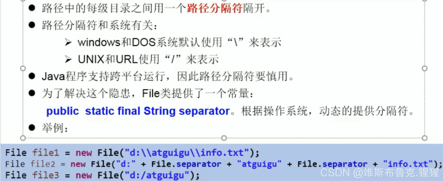 4.后续File类的对象常会作为参数传递到流的构造器中,指明读取或写入的"终点"。