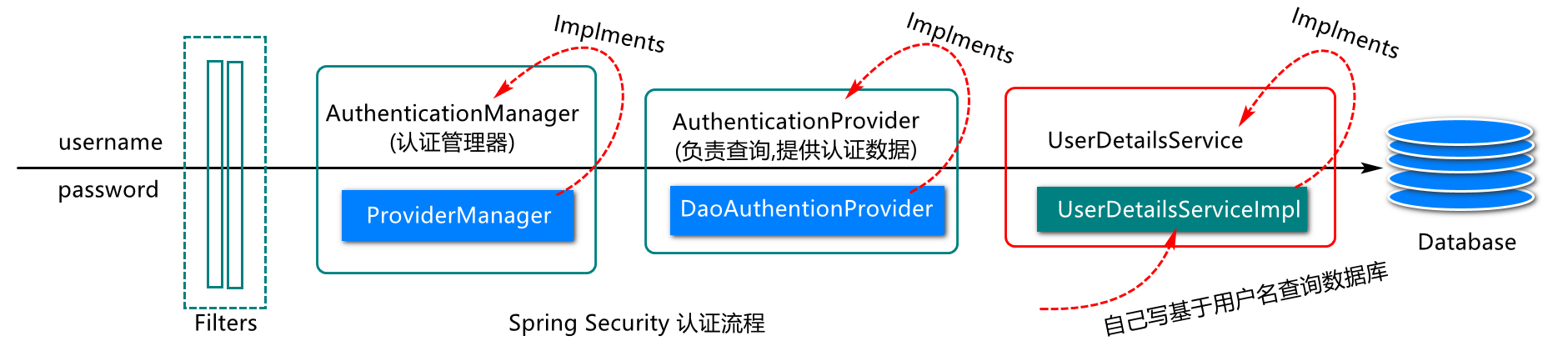 Spring Security 提供了一个UserDetailService接口,我们可以基于此接口实现类,实现用户信息的获取和封装,例如: