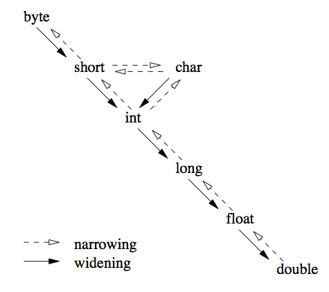 如果我们从低精度类型转换成高精度类型,则不存在信息损失的顾虑。这样的变换叫做宽松变换(widening conversion)。我们不需要显示的要求类型转换,Java可以自动进行: