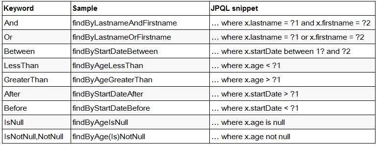 通过继承接口,spring data会自动实现基本的crud方法,同时,还支持通过方法的形式扩展自己想要的方法,例如通过以下关键词扩展(图片在网上找的):