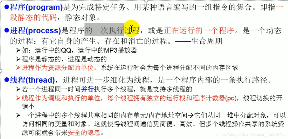 线程作为调度和执行的单位,每个线程拥有独立的运行栈和计数器,每个进程拥有独立的方法区和堆;意味着,多个线程共享一个方法区和堆。而共享的就可以优化,同时,共享的也会带来安全隐患,这就需要我们解决线程安全问题