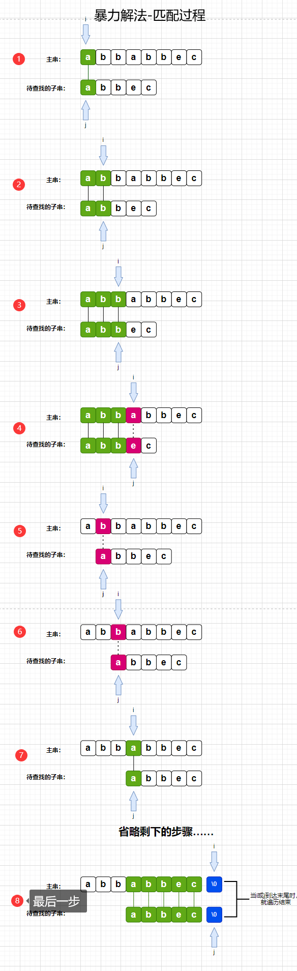 上图就是暴力解法的全部过程,通过匹配一个个字符,如果当前字符匹配成功,i和j就同时走一步;如果当前字符匹配不成功,i 就应该回到当前开始的第一个字符的下一个字符:比如图中步骤4和步骤5,就是说的这个意思,当前是从第一个字符a开始匹配的,此时匹配失败了,i就应该回到a字符的下一个字符,j就从0下标开始,继续往下匹配;