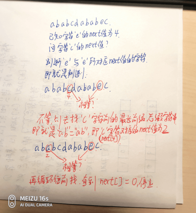 其实next数组,计算的待查找的子串的每个字符(不包括当前字符)前面的所有字符中,前缀字符串和后缀字符串相等的,并且最长的字符个数。比如: