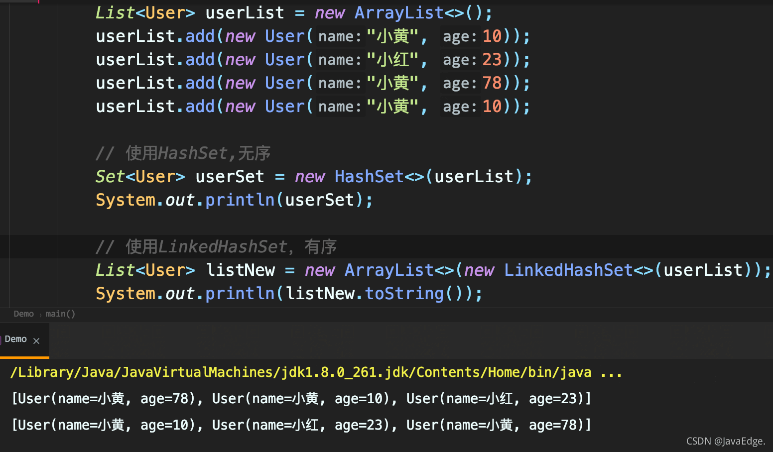 System.out.println("根据name,age去重后集合元素:" + uniqueNameAndAgeList.toString());