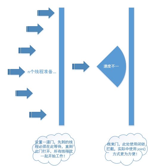 CountDownLatch有类似功能的,还有个工具栅栏 CyclicBarrier, 也是提供一个等待所有线程到达某一点后,再一起开始某个动作,效果一致,不过栅栏的目的确实比较纯粹,就是等待所有线程到达,而前面说的闭锁CountDownLatch虽然实现的也是所有线程到达后再开始,但是他的触发点其实是 最后那一个开关,所以侧重点是不一样的。