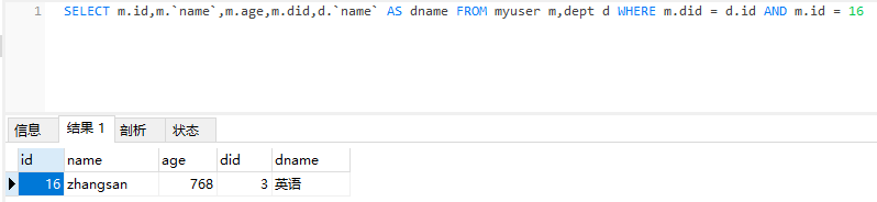 SELECT m.id,m.name,m.age,m.did,d.name AS dname FROM myuser m,dept d WHERE m.did = d.id AND d.id = #{id}
