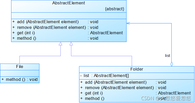 在这里父类 Component 是一个抽象构件类,Folder 类是一个容器构件类,File 是一个叶子构件类,Folder 和 File 继承了 Component,Folder 与 Component 又是聚合关系