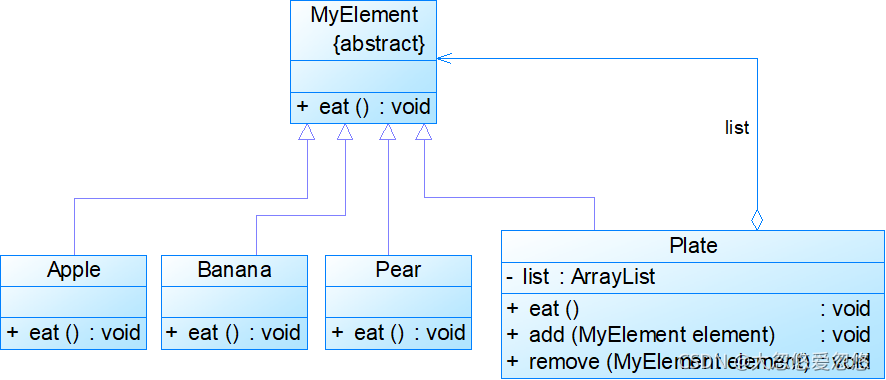 在水果盘(Plate)中有一些水果,如苹果(Apple)、香蕉(Banana)、梨子(Pear),当然大水果盘中还可以有小水果盘,现需要对盘中的水果进行遍历(吃),当然如果对一个水果盘执行“吃”方法,实际上就是吃其中的水果。使用组合模式模拟该场景 。