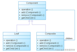 - Component(抽象构件):它可以是接口或抽象类,为叶子构件和容器构件对象声明接口,在该角色中可以包含所有子类共有行为的声明和实现。在抽象构件中定义了访问及管理它的子构件的方法,如增加子构件、删除子构件、获取子构件等。