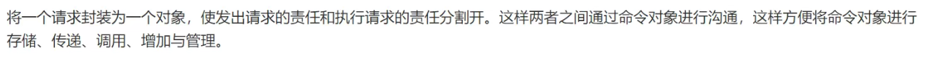每一个命令都是一个操作:请求的一方发出请求要求执行一个操作;接收的一方收到请求,并执行操作。命令模式允许请求的一方和接收的一方独立开来,使得请求的一方不必知道接收请求的一方的接口,更不必知道请求是怎么被接收,以及操作是否被执行、何时被执行,以及是怎么被执行的。