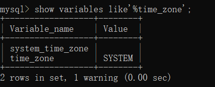 show variables like'%time_zone'; (注意不要漏掉后面的分号),回车