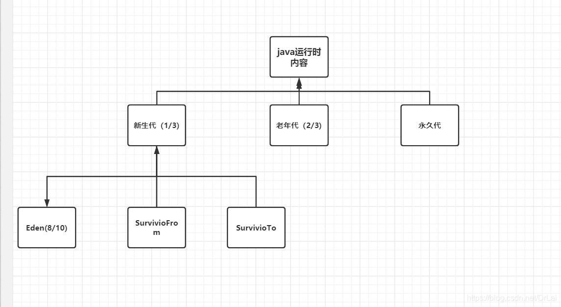 而新生代分为Eden,SurvivorFrom,SurvivorTo区,Eden默认占8/10新生代区域空间,SurviorFrom和SurviorTo则占1/10.
